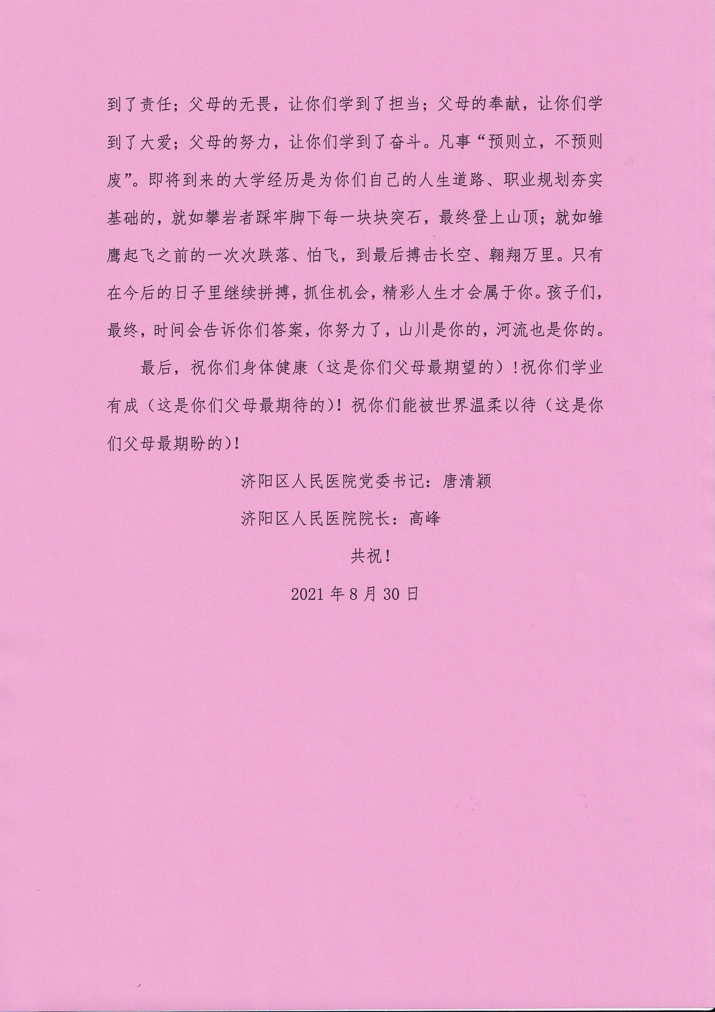 “历尽世间沧桑事,始知悠悠父母心”,父母的敬业,让你们学到了责任;父母的无畏,让你们学到了担当;父母的奉献,让你们学到了大爱;父母的努力,让你们学到了奋斗。凡事“预则立,不预则废”。即将到来的大学经历是为你们自己的人生道路、职业规划夯实基础的,就如攀岩者踩牢脚下每一块块突石,最终登上山顶;就如雏鹰起飞之前的一次次跌落、怕飞,到最后搏击长空、翱翔万里。只有在今后的日子里继续拼搏,抓住机会,精彩人生才会属于你。孩子们,最终,时间会告诉你们答案,你努力了,山川是你的,河流也是你的。