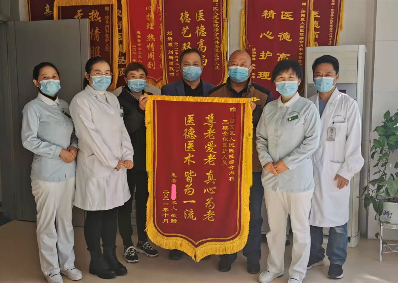 10月22日上午,综合内科张大爷家属将一面印有“尊老爱幼真心为老,医德医术皆为一流”的锦旗和一封感谢信送到护士站,以表示对科主任何邦志、护士长刘桂荣及全体医护人员的衷心感谢。
