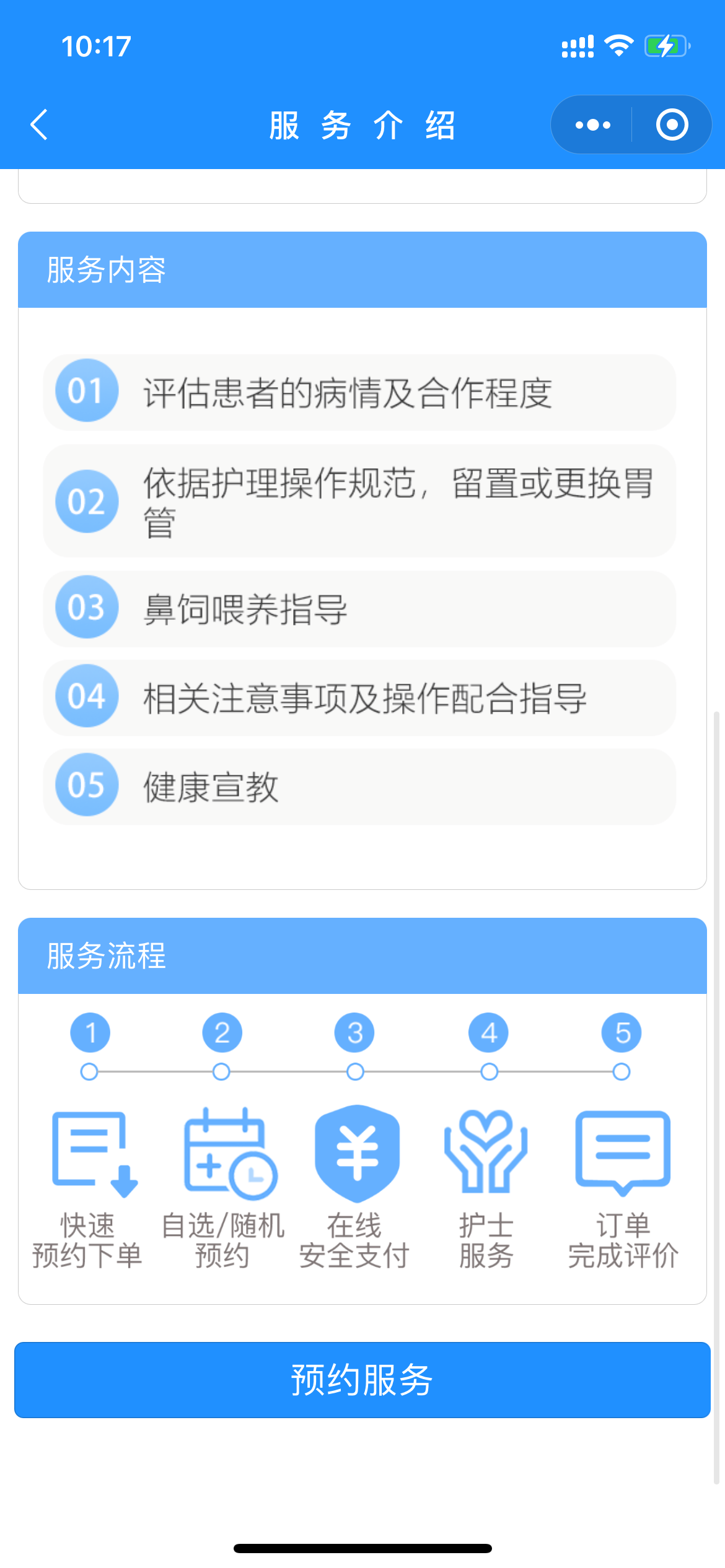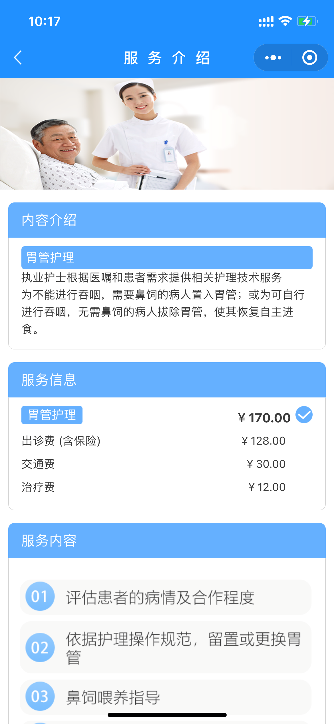 1.患者通过首页-搜索栏查找所需的服务项目,如:胃管护理、尿管护理等,或在专科护理分类中查找相应的服务项目