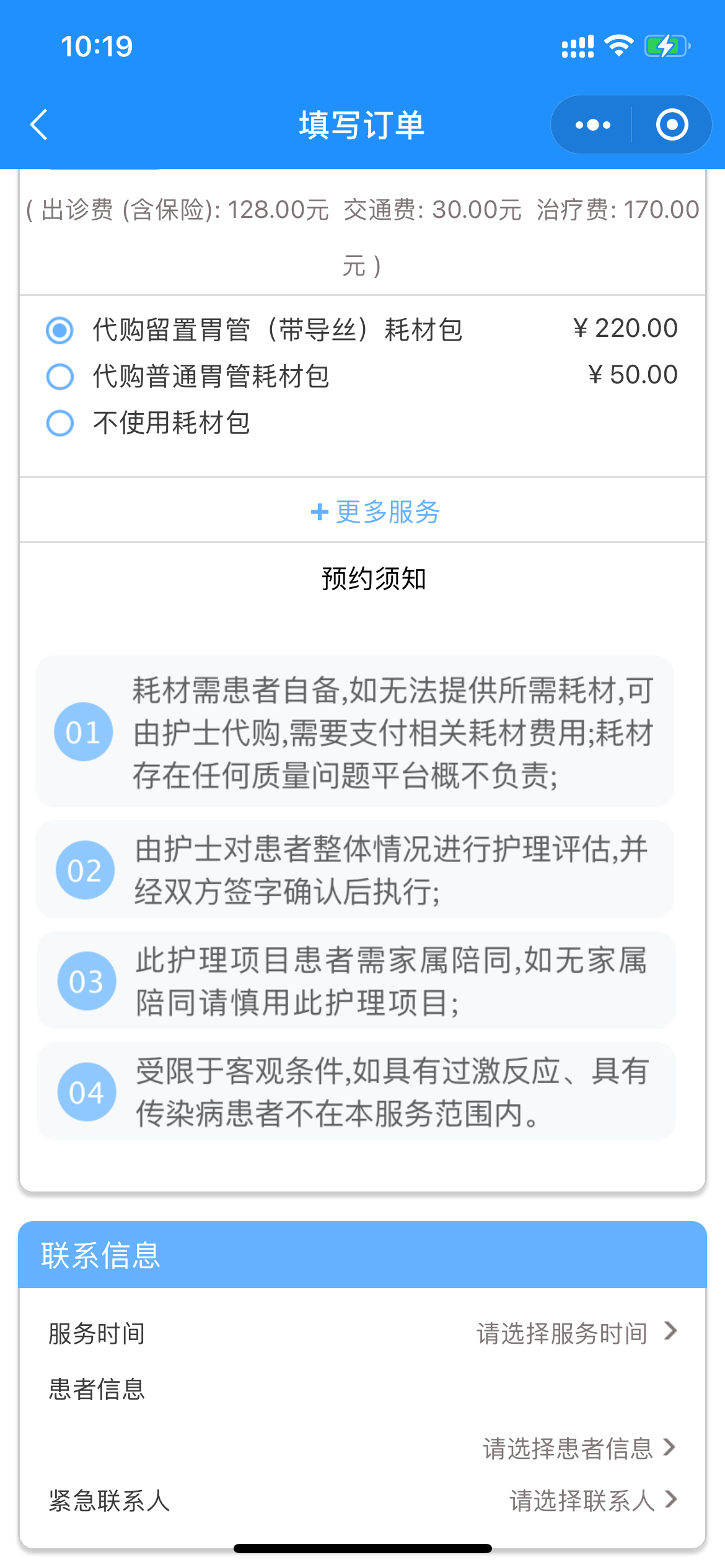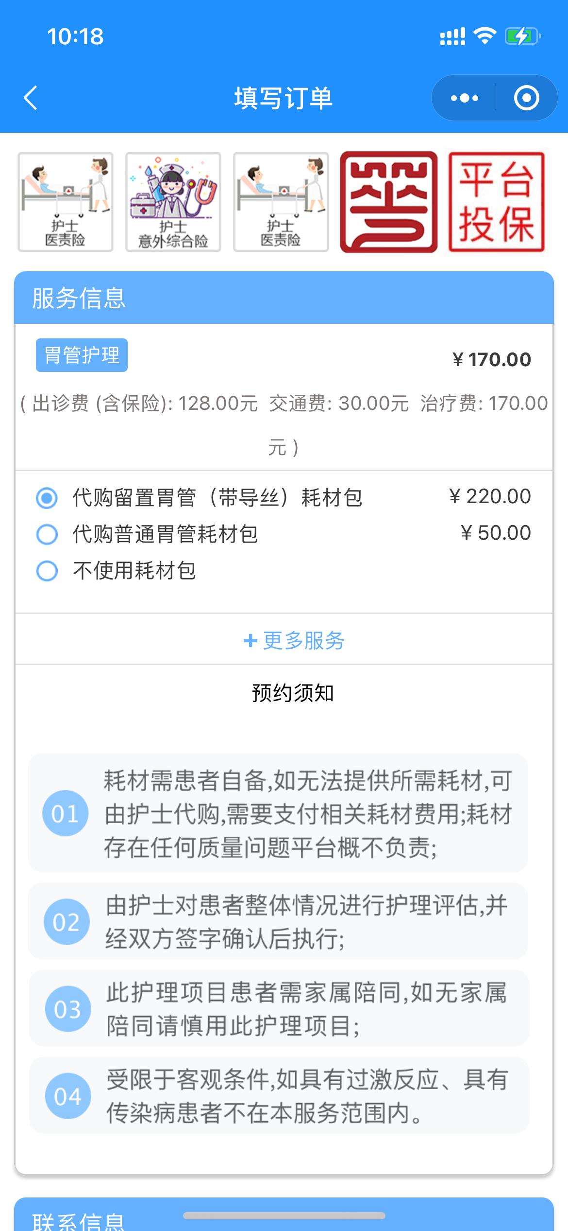 3.患者按需选择耗材包、填写联系信息。最上方为平台为患者和医护人员购买的医责险及意外保障险。