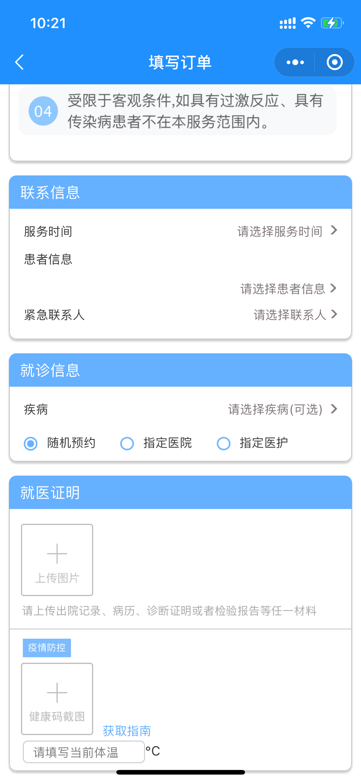 4.选择预约服务时间、添加患者信息、选择紧急联系人。