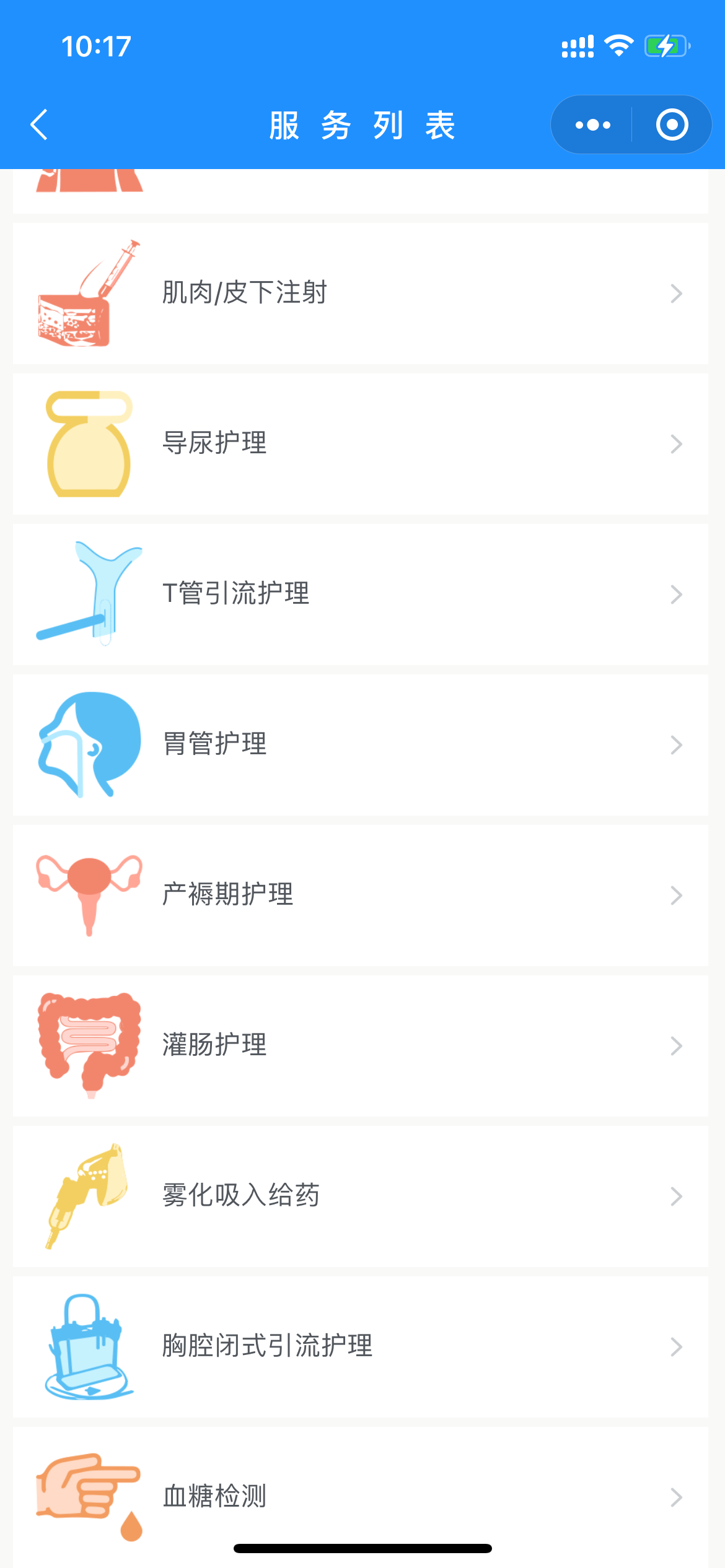 胃管护理、导尿护理、PICC置管护理、压疮伤口造口护理、氧气吸入护理、肌肉/皮下注射、静脉采血、静脉留置针护理、会阴护理、膀胱冲洗护理、吸痰护理、糖尿病足护理、骨科术后护理、口腔护理、、产后护理、新生儿黄疸测量、新生儿护理等。