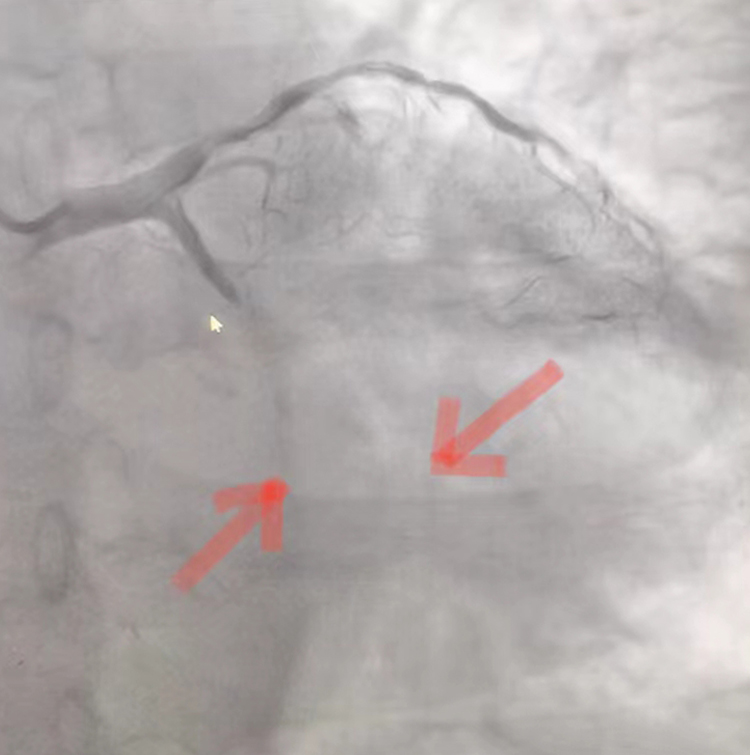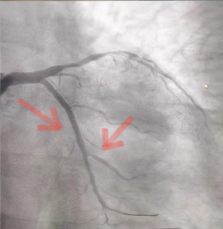 无独有偶,术后短暂休息时刻,又一位64岁突发急性心梗并心衰患者转入CCU,考虑到患者病情较重,副主任李雷再次投入战斗。在第一时间给予抗血小板、抗凝治疗的同时和家属沟通病情,联系导管室及我院介入团队邢建龙医生急行冠脉造影,显示患者冠脉三支重度病变,左冠弥漫性钙化,回旋支自近段100%急性闭塞,前降支近段80-90%狭窄,自中段100%慢性闭塞。病情危重,情况紧急!患者回旋支及前降支有急诊PCI指征,但术中可能出现恶性心律失常、低血压休克,甚至猝死可能,李主任再次和家属沟通病情,征得家属同意后签署相关知情同意书。事不宜迟!抢救仪器及药品就绪,立即追加肝素,沿桡动脉鞘管送EBU3.5指引导管至左冠开口,手术开始。9分钟后,导丝顺利通过旋支狭窄部位并应用硬球囊预扩完成,造影提示病变血管再灌注,借助支架精准定位技术,成功将一枚2.75×16mm支架植入旋支近段。球囊后扩后复查造影示支架展开良好。然而手术医生不敢有丝毫懈怠,继续乘胜追击,终将导丝通过前降支慢性病变并对其成功实施冠脉成形术,再次造影示冠脉无夹层、撕裂,前向血流通畅。29分钟后患者安返病房,后胸痛及憋喘症状逐渐缓解,心电图示心肌缺血明显改善。目前病人恢复良好,预计不久即可出院。
