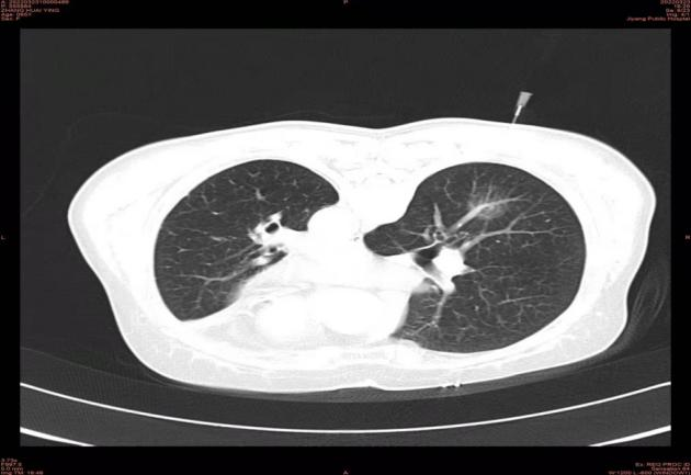 患者张某,65岁,老年女性,于2022年2月份查体发现双肺占位,左肺上叶软组织密度灶(直径约4cm)、右肺磨玻璃结节灶(GGO,直径约3cm),针对左肺占位行CT引导下穿刺活检,病理提示肺腺癌,经我院MDT多学科专家会诊讨论,为该患者制定了序贯式治疗方案:1、左肺肿瘤实行外科手术切除;2、右肺病变实行经皮穿刺微波消融术。患者于2022年2月份在胸外科全麻下行胸腔镜下左肺上叶切除+纵隔淋巴结清扫术,术后恢复顺利,回家休养。