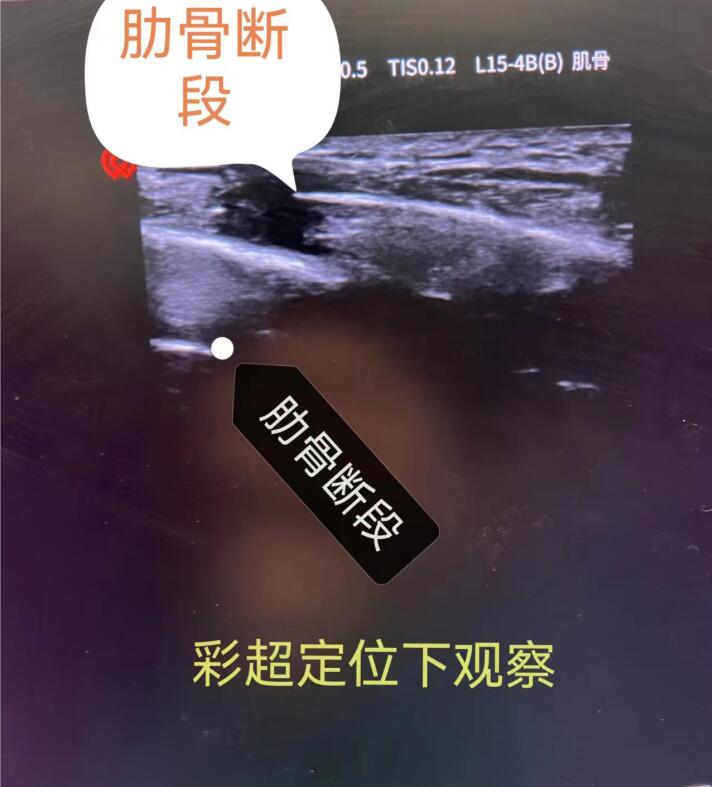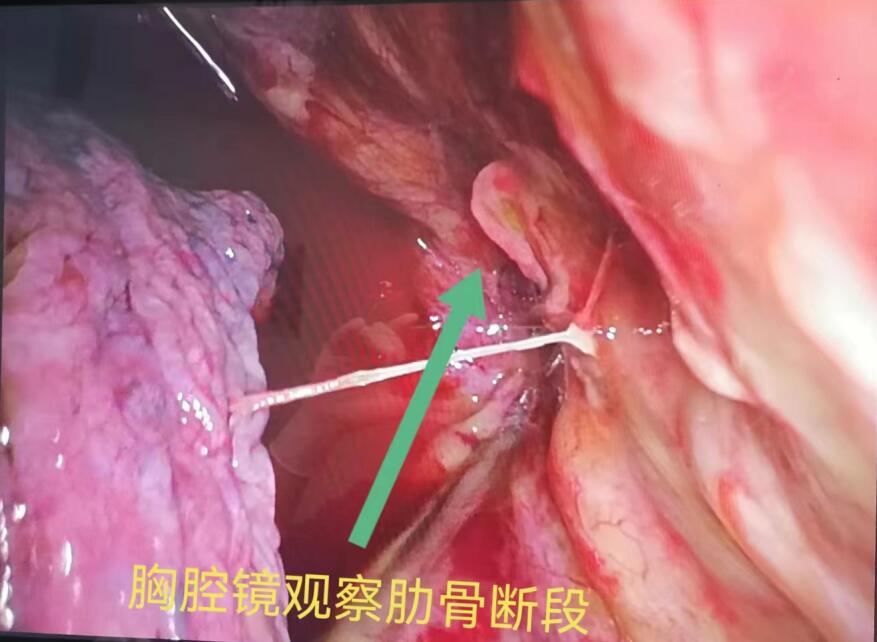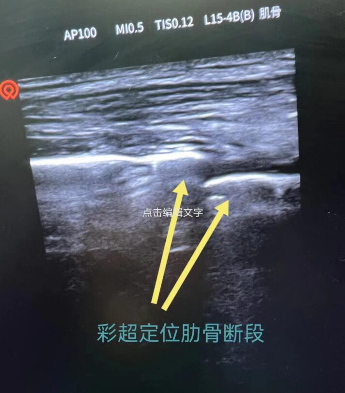 通过反复讨论,决定通过术前彩超直视下精准定位探及骨折断端并于体表标记,术中胸腔镜探查胸腔内脏器损伤及骨折断端情况进一步确认切口选择的准确性,然后设计切口以尽可能减小术中创伤,减少术后疼痛,促进患者康复。