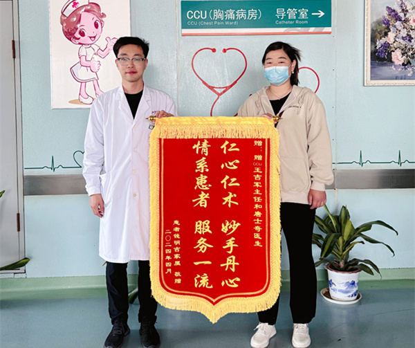 经过一周的恢复,钱大爷遵医嘱可以出院,但是家属对当天抢救的情景仍铭记在心,要当面感谢王吉军副主任和唐士奇医生,特赠送锦旗表达心意。锦旗代表着感谢,更是对医护人员的激励,让大家在从医的道路上时时怀有仁心,刻刻施行仁术。