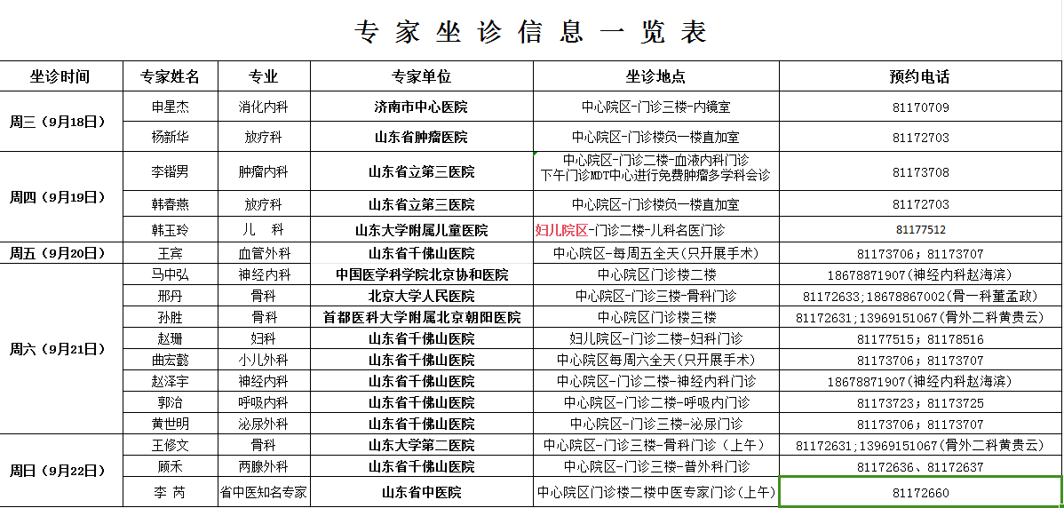 【专家动态】| 名医专家坐诊信息一览表 (9.18-9.22)