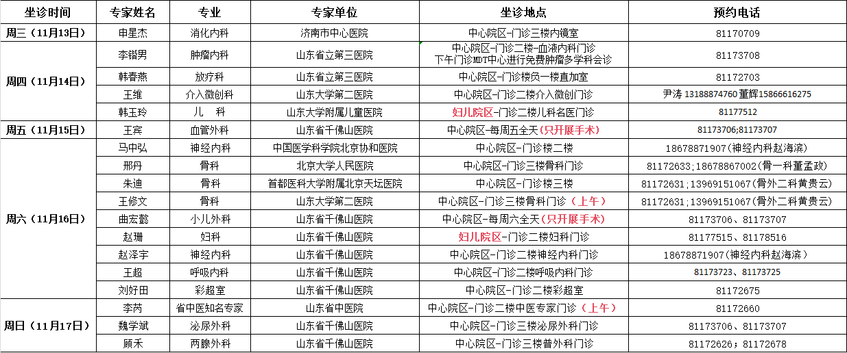【专家动态】| 名医专家坐诊信息一览表 (11.13—11.17)