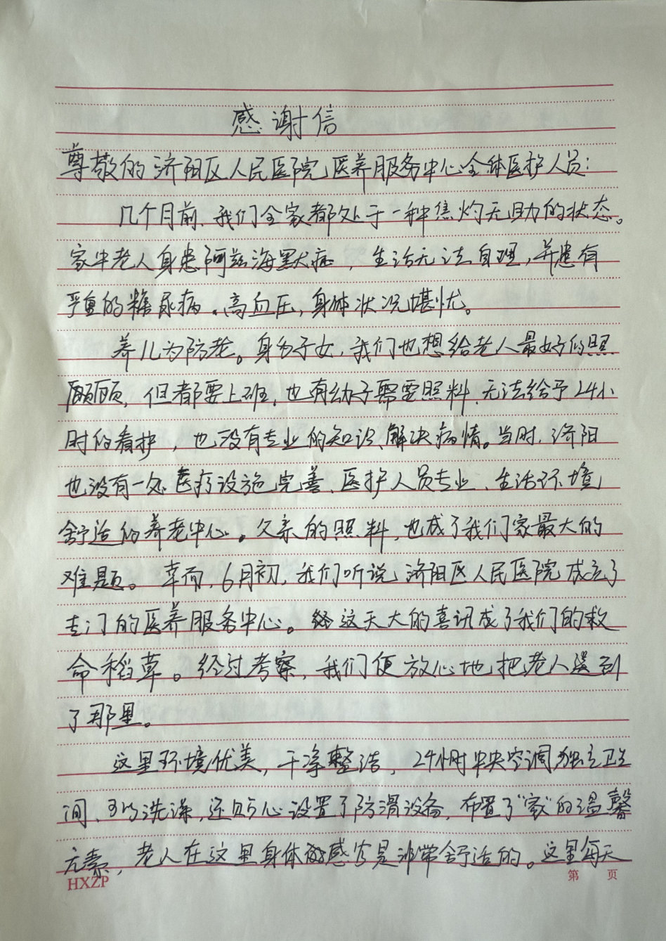 7月27日上午,济阳区人民医院医养服务中心收到了一面饱含深情的锦旗和一封手写感谢信,患者家属对中心医护人员及护理团队在照护阿尔茨海默病老人过程中的专业、耐心和爱心表达了诚挚谢意。