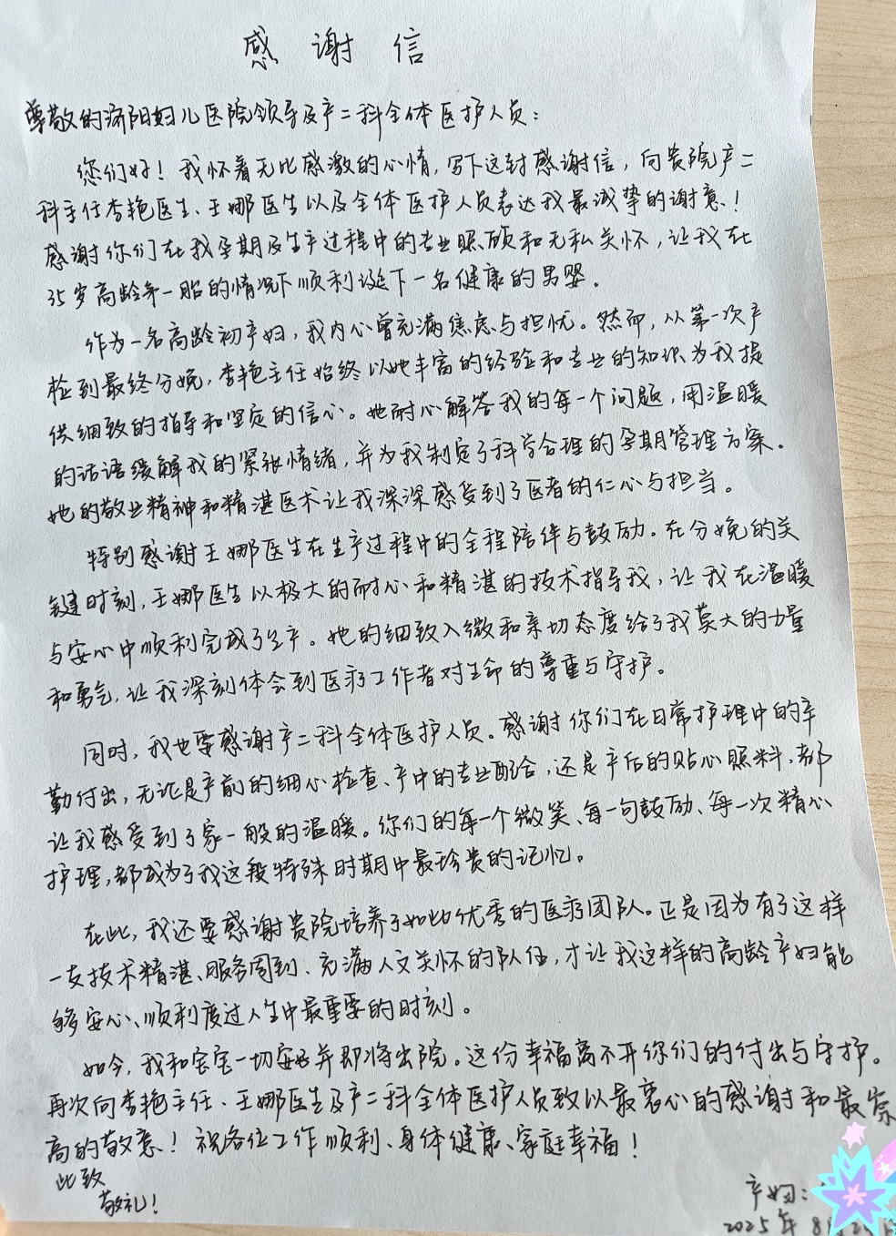 出院前夕,付女士和家人特意送来了感谢信和锦旗。一面锦旗,一封感谢信,传递的不仅是患者的感激之情,更是对我院医疗质量和服务水平的认可,是对医护人员无私奉献的最好回报。它激励着我们始终秉承“以患者为中心”的服务理念,不断提升医疗技术,优化服务质量,用爱心、耐心、责任心和精湛的医术,为更多母婴的生命健康保驾护航。