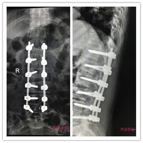 术后,患者腰腿疼痛症状明显缓解,拍片复查脊柱矫形满意,切口愈合良好,目前,患者正在康复中。