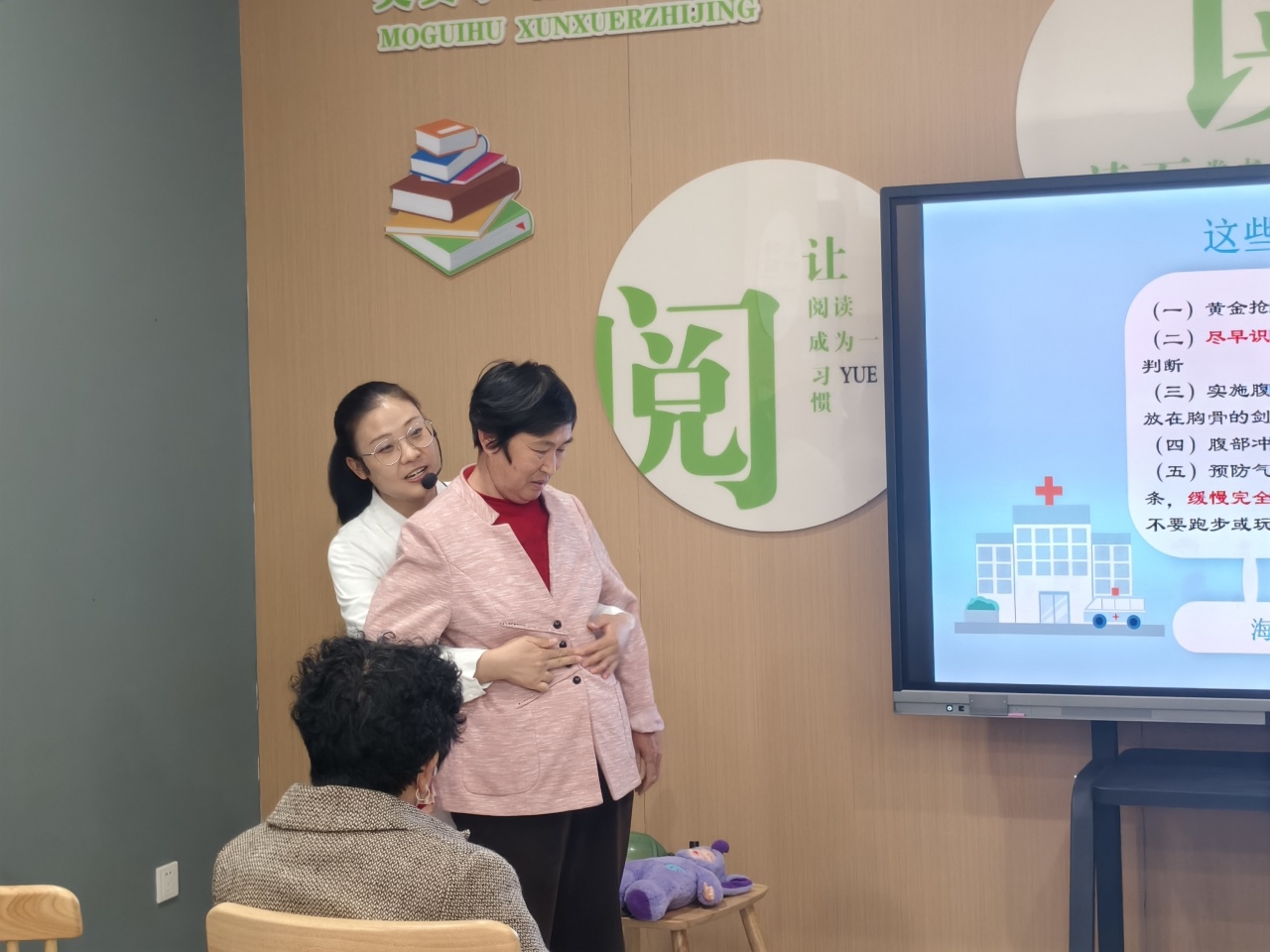 ICU主管护师李甜甜凭借丰富的经验和专业的知识,通过图文并茂的PPT,深入浅出地讲解了海姆立克急救法的原理、适用场景,用剪刀石头布手法解锁急救操作要点,结合不同年龄段人群的特点,分别进行了详细演示和互动,让对在场的居民对日常生活中出现呛食等意外发生时的急救知识有了更直观的认识,在场居民积极互动,连连称赞,有效的提高了居民群众的自救能力。