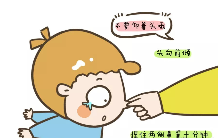 儿童鼻出血的基本处理方法,即“取坐位头前倾,捏鼻孔嘴呼吸,不松手10分钟”。