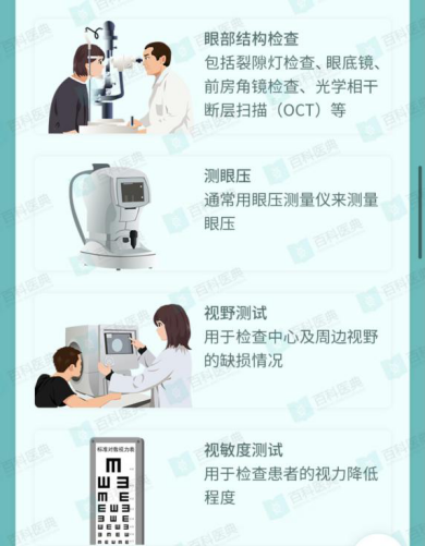 临床检查主要包括眼部结构检查、测眼压、视野测试、视敏度测试。此外,角膜厚度检查也有助于判断患者发生青光眼的风险。
