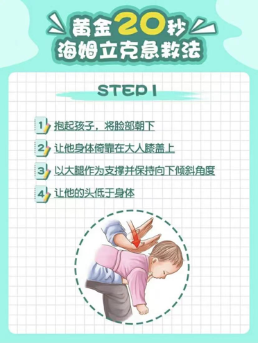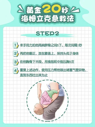 首先,施救者一只手固定住患儿头部,将其面部朝下,保持头低脚高,用另一只手掌根部连续叩击肩胛骨连线中点处5次。然后,将患儿翻转成面部朝上,保持头低脚高,检查有无异物排出;如未发现异物,立即用中指和食指按压患儿两乳头连线中点处5次。反复交替操作上述两个步骤,直到异物排出。
