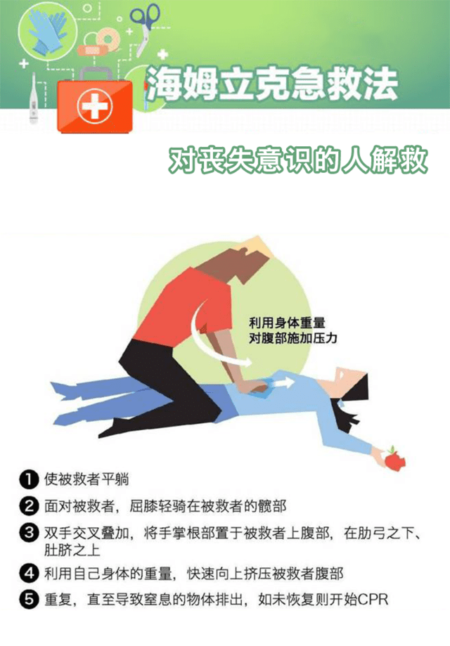 若患者意识不清或站立位不便于施救时,可让患者平躺,首先开放患者的呼吸道,然后施救者骑跨在患者大腿外侧,一手以掌根按压脐上两横指的部位,两手掌交叉重叠,连续、快速、用力向患者的后上方冲击,直到异物排出。