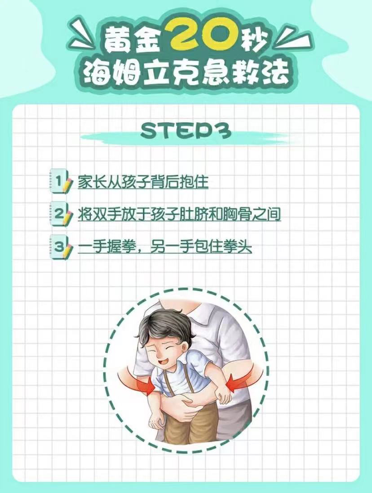 施救者站在患者身后,儿童身高较矮者,施救者可跪在其身后,然后施救者一条腿在前,插入患者两腿之间呈弓步,另一条腿在后伸直,双臂环抱患者腰部,使其上身前倾。手法与成人相似。