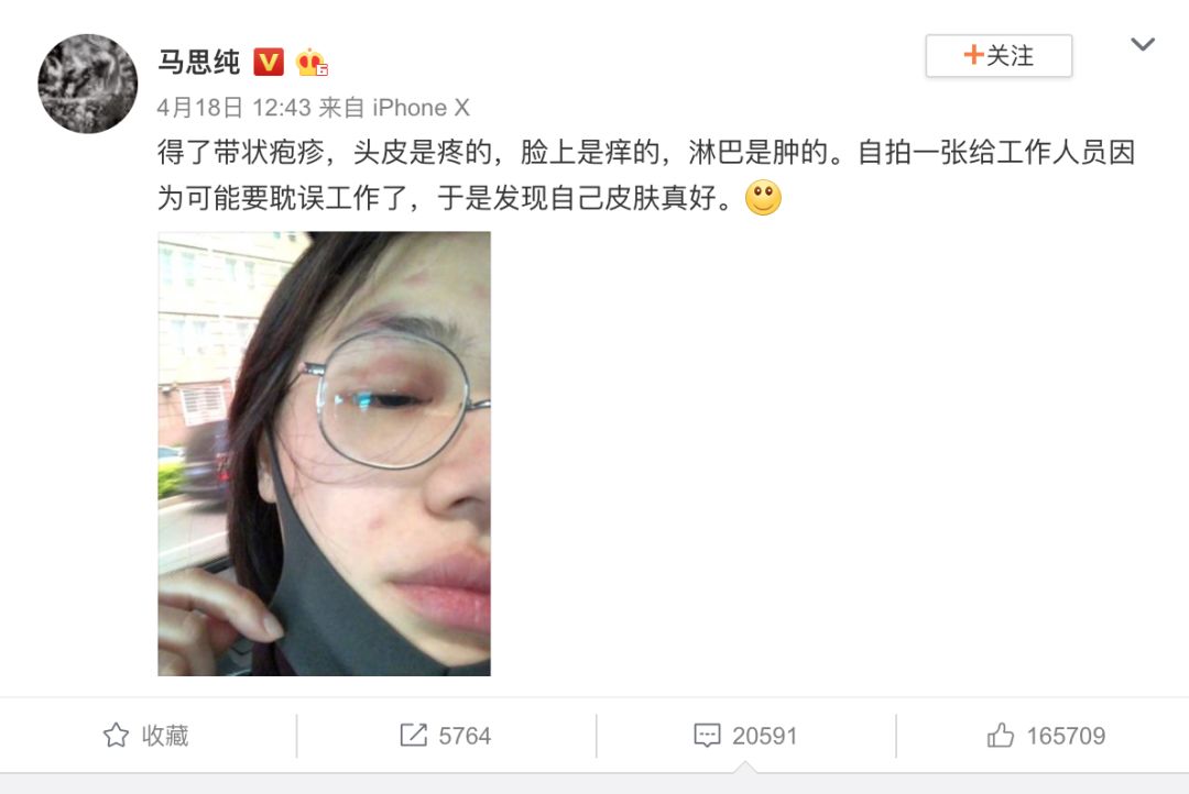 4月18日,马思纯在微博上传一张照片,留言称:“得了带状疱疹,头皮是疼的,脸上是痒的,淋巴是肿的。”照片中明显看到马思纯的眼皮、面颊和额头都已经发红,网友纷纷表示心疼。