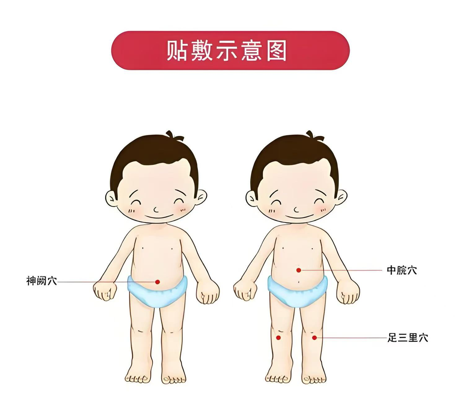 贴敷穴位:神阙穴、中脘穴、天枢(双)、涌泉(双)或足三里(双)一套六穴,上和胃、中健脾、下强体,全方位呵护孩子娇嫩脾胃。