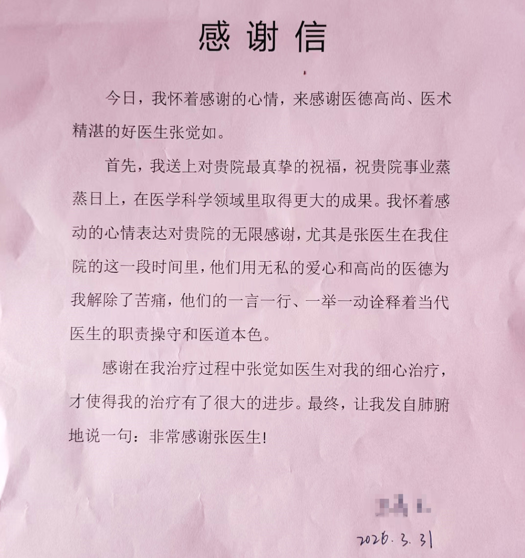 仅用三周时间,患者的肩关节活动范围便大幅提升,接近正常水平,疼痛明显缓解,彻底摆脱术后僵硬困扰,重新回归正常生活。患者在感谢信中写道:“感谢医德高尚、医术精湛的好医生张觉如。她用爱心与医德为我解除病痛,一言一行都诠释着医者本色。”
